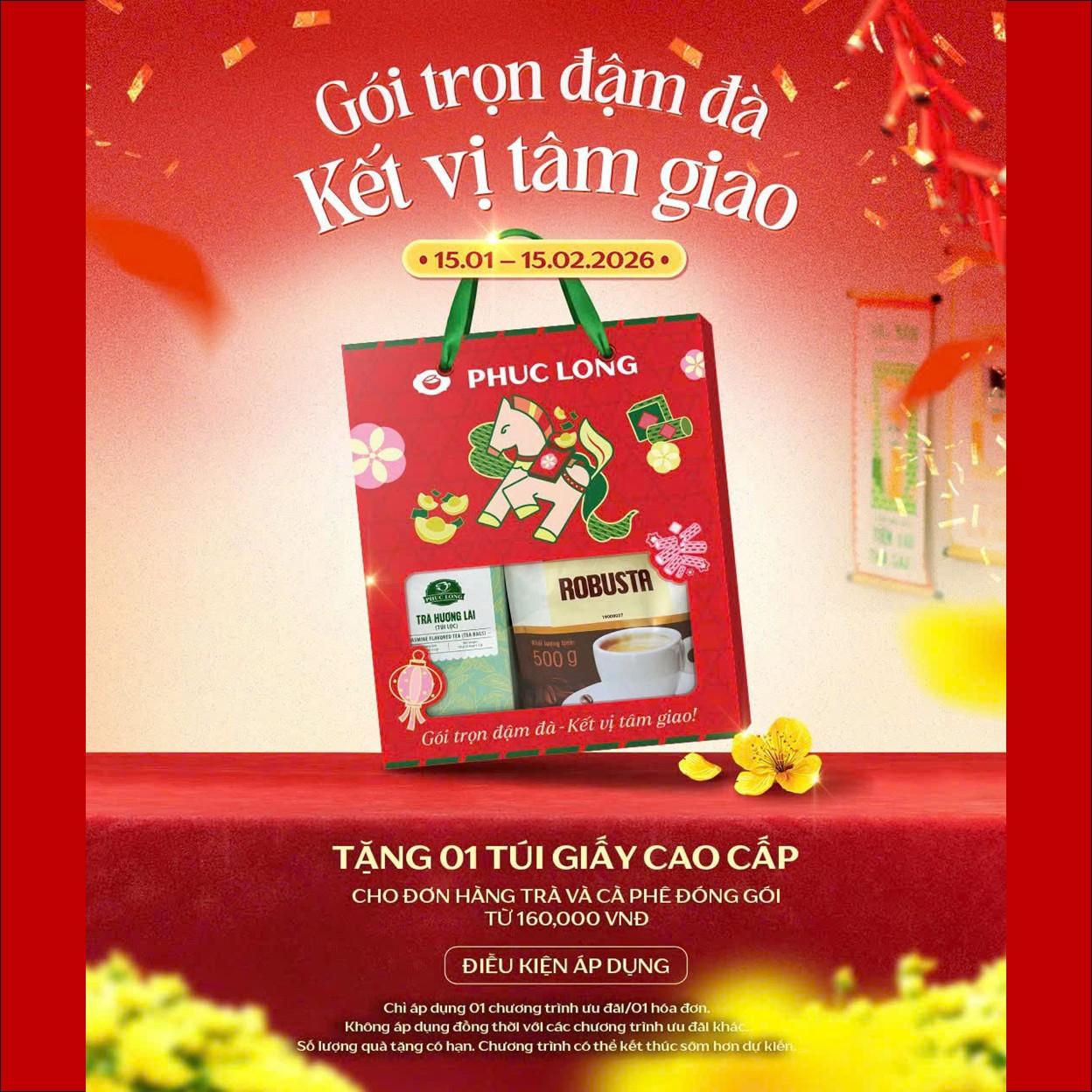 Welcoming the bright Year of the Horse, from January 15 to February 15, 2026, Phúc Long gifts you a Premium Tết Paper Bag for packaged Tea and Coffee orders from 160,000 VND 🍃.