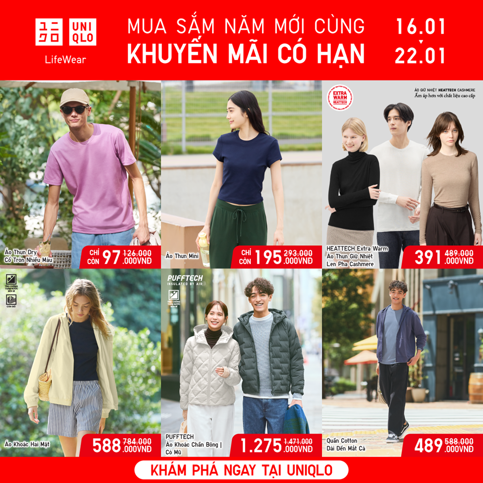 From 16.01 to 22.01, UNIQLO brings you attractive deals on a wide range of everyday essentials, including Dry Color Crew Neck T-Shirt, Mini T-Shirt, Outerwear, and Long Pants, with special prices starting from 97,000 VND — perfect for the whole family to enjoy outdoor activities at the start of the year.