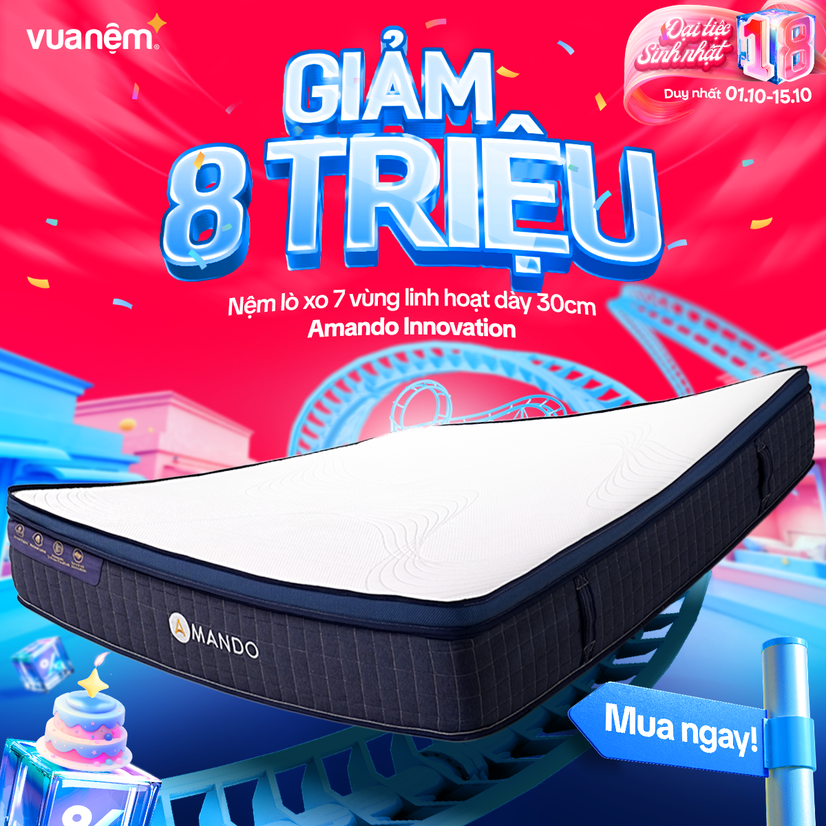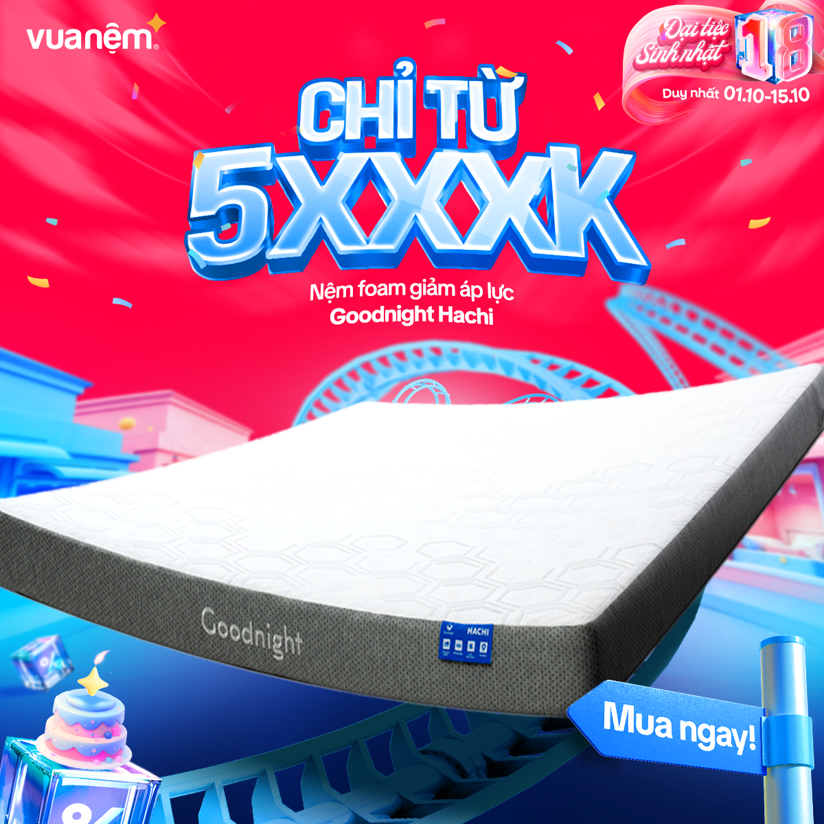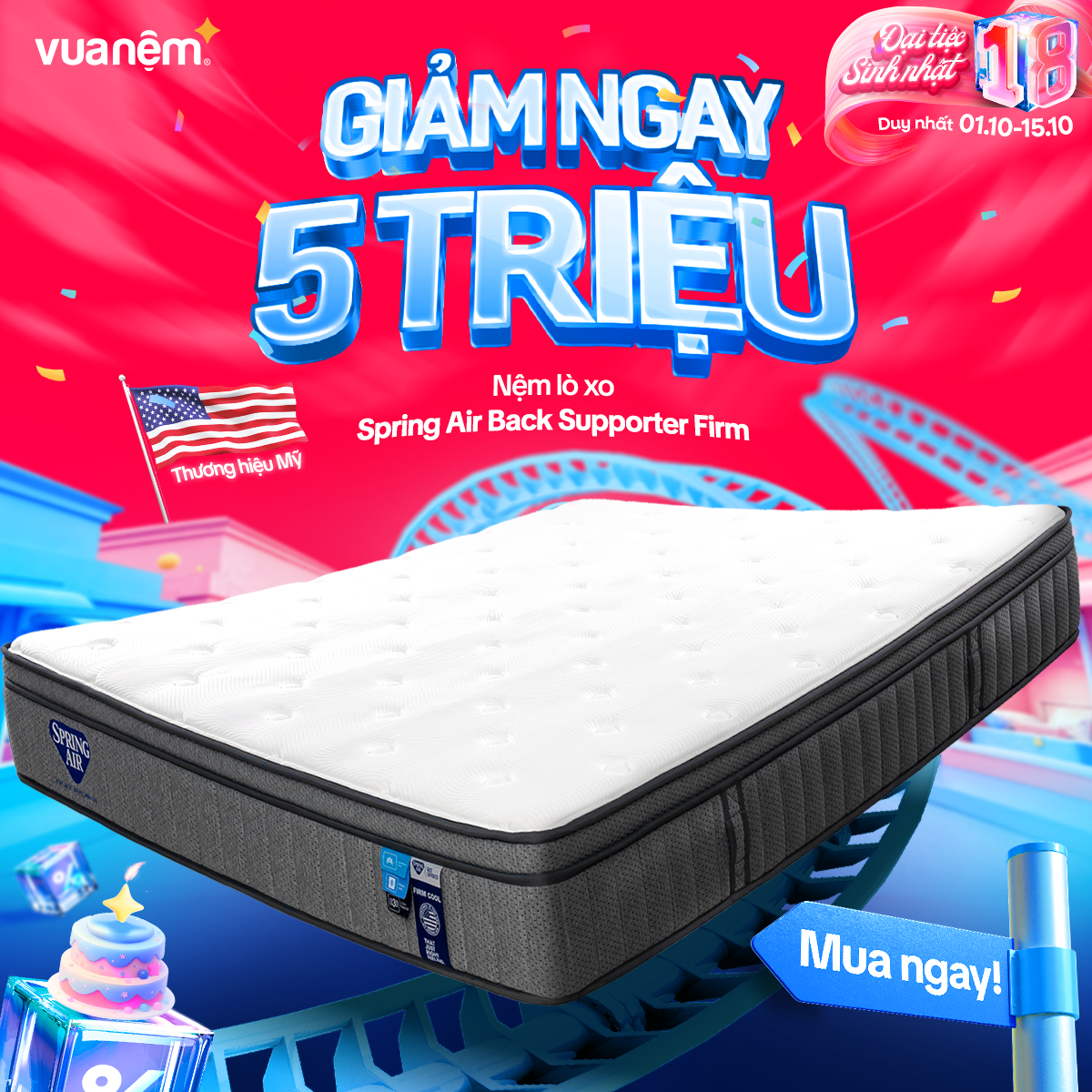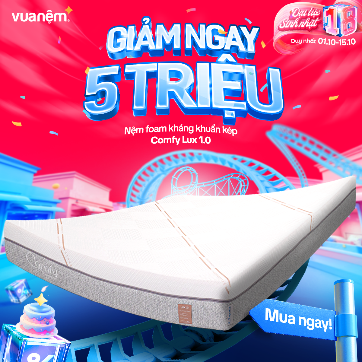 🎉 From 01/10 – 15/10, Vua Nệm goes big for its 18th birthday with crazy hot deals, tons of gifts, and unbeatable discounts worth up to tens of millions! The golden chance to own premium, authentic mattresses like never before: