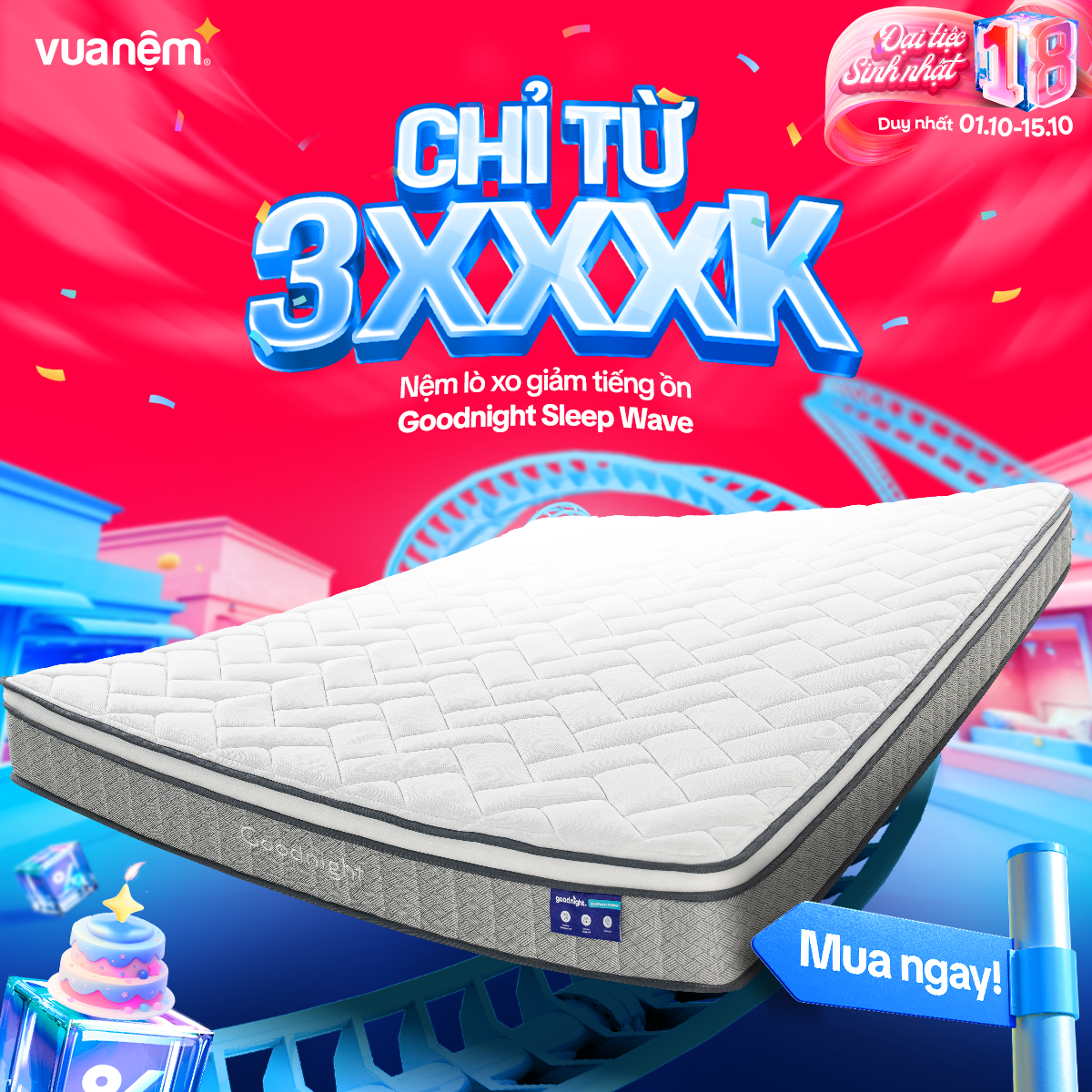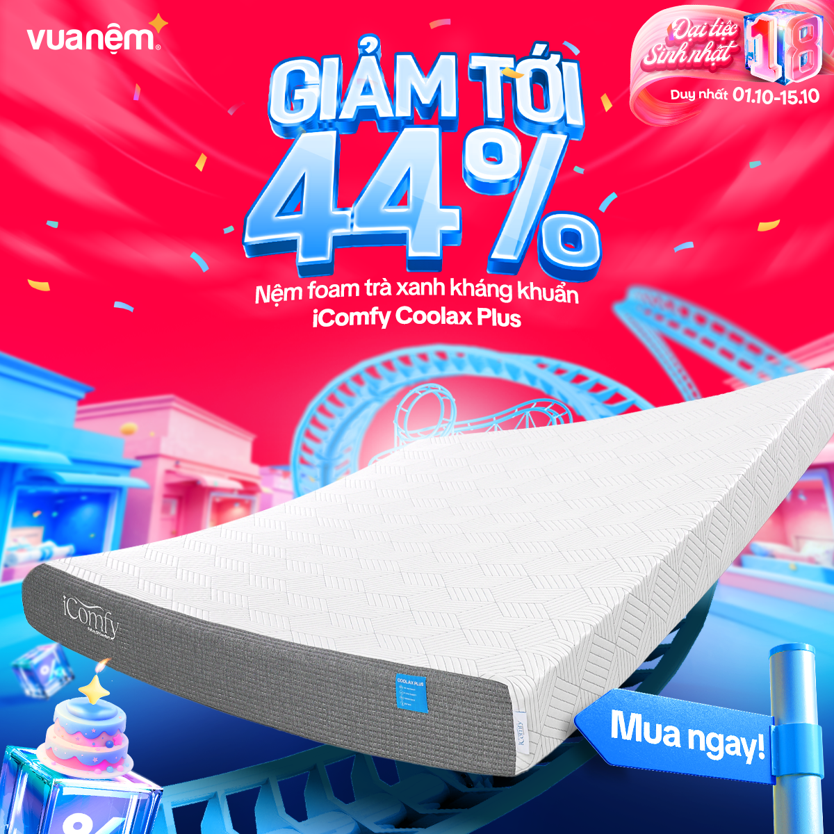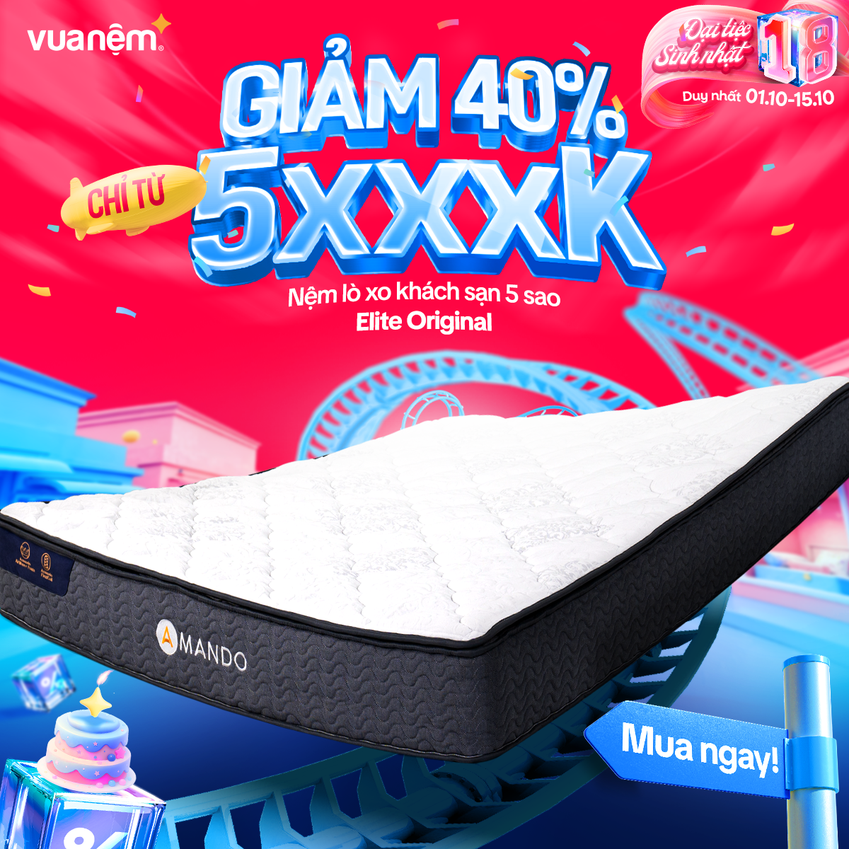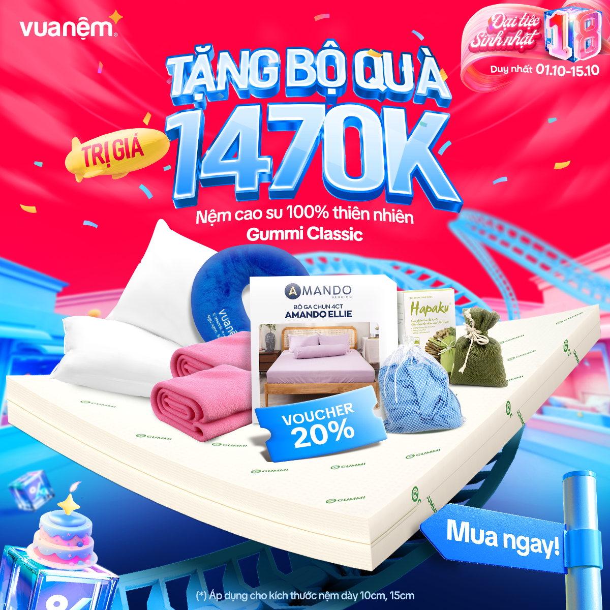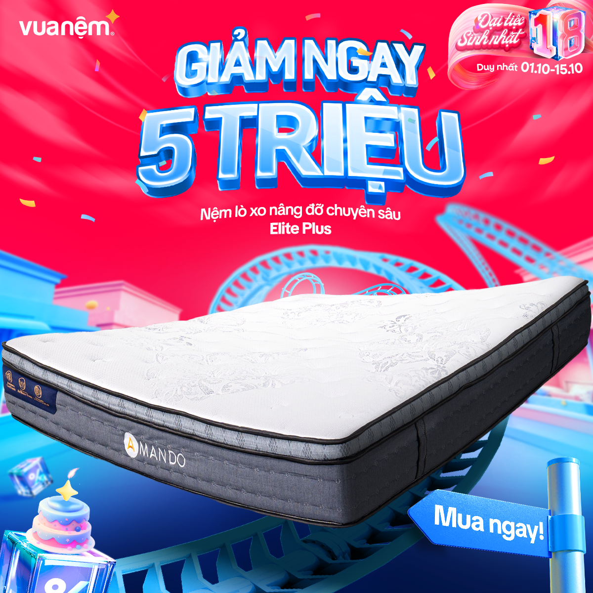 🎉 From 01/10 – 15/10, Vua Nệm goes big for its 18th birthday with crazy hot deals, tons of gifts, and unbeatable discounts worth up to tens of millions! The golden chance to own premium, authentic mattresses like never before: