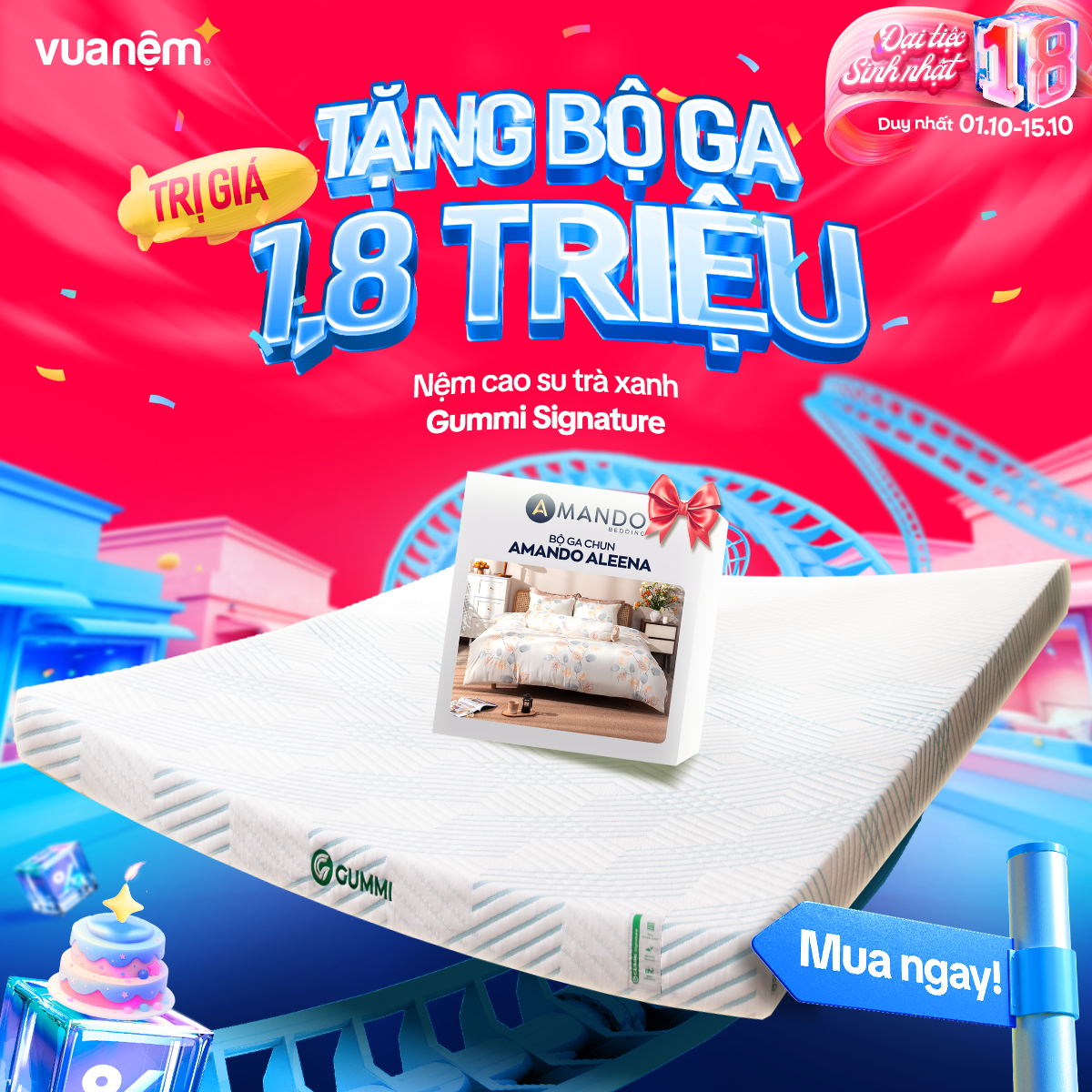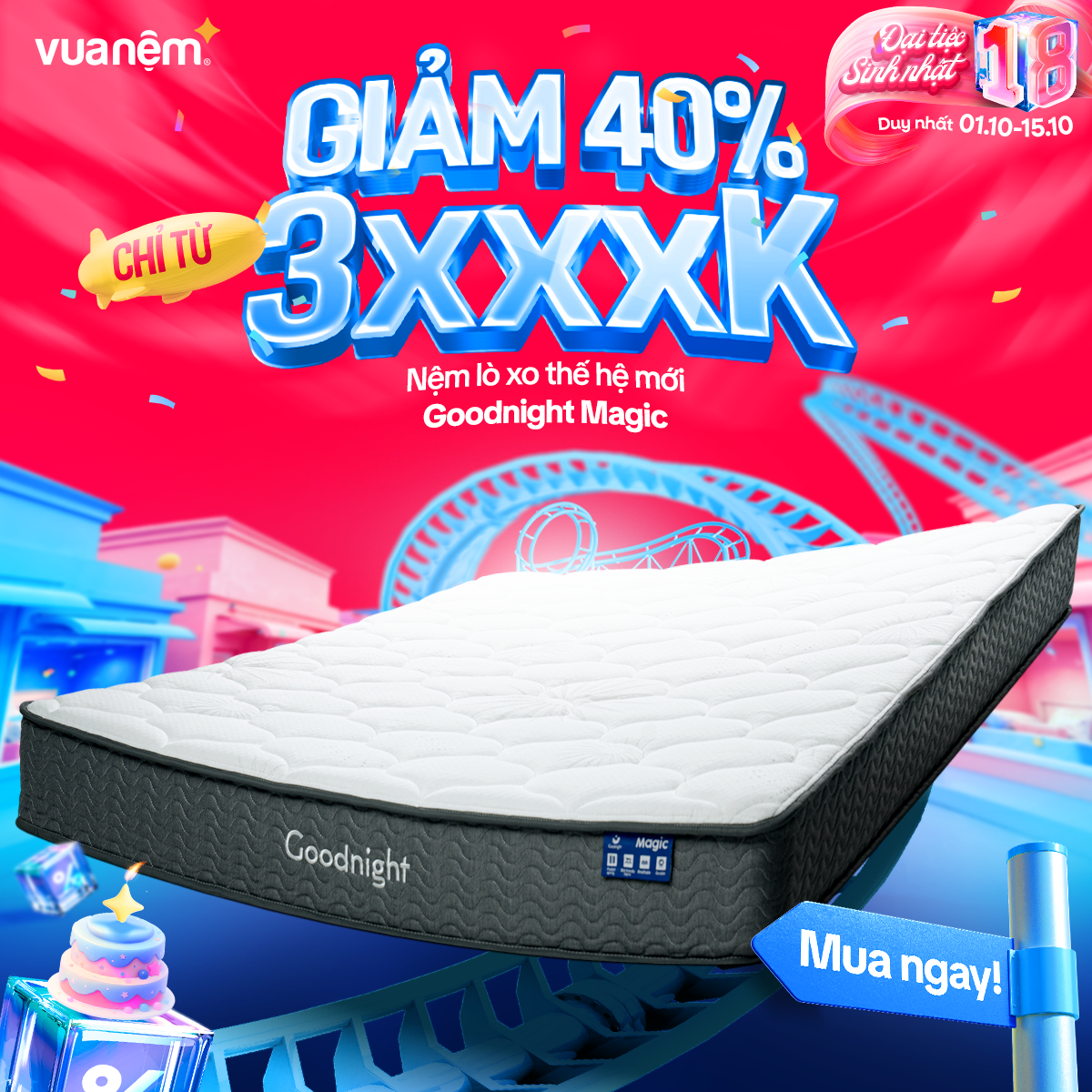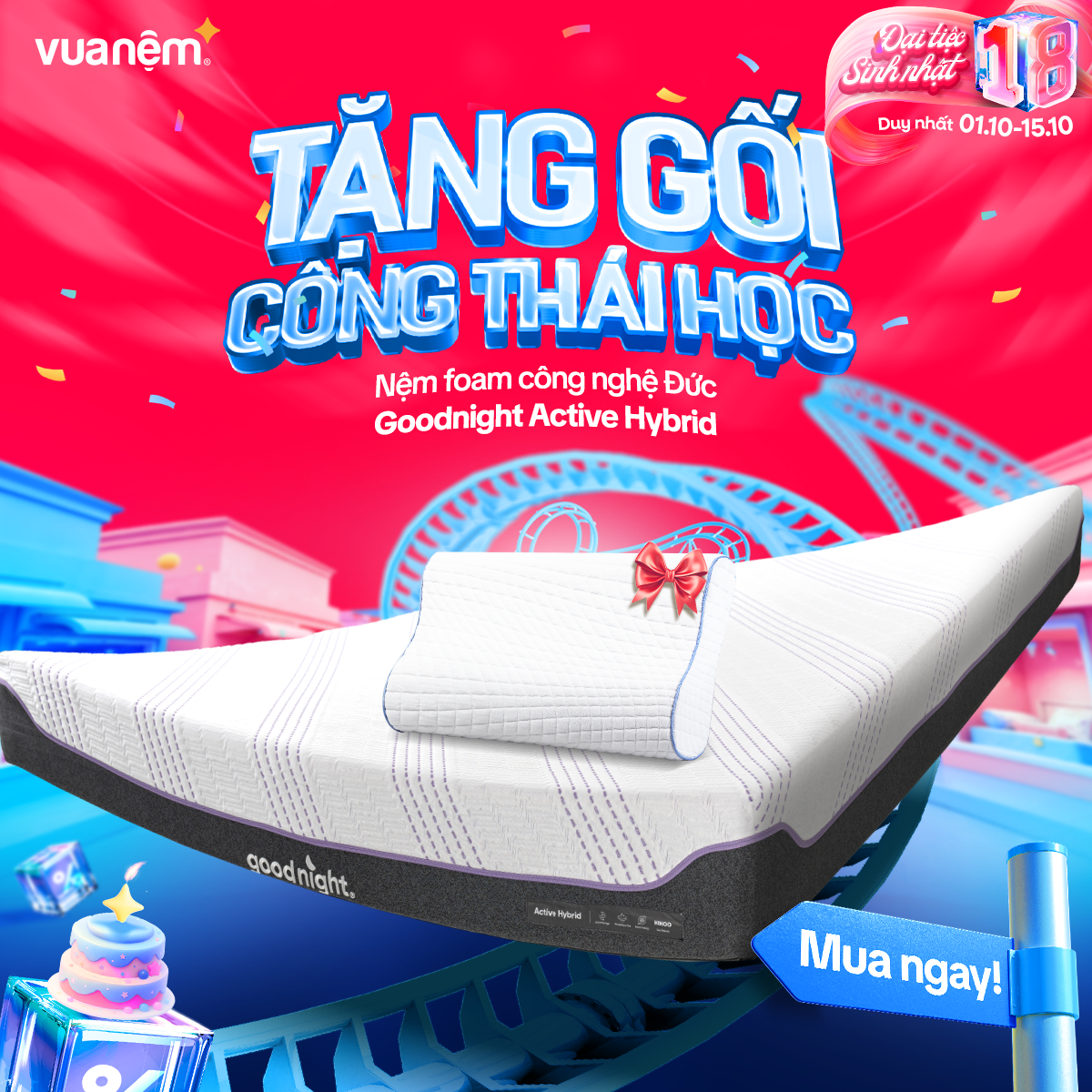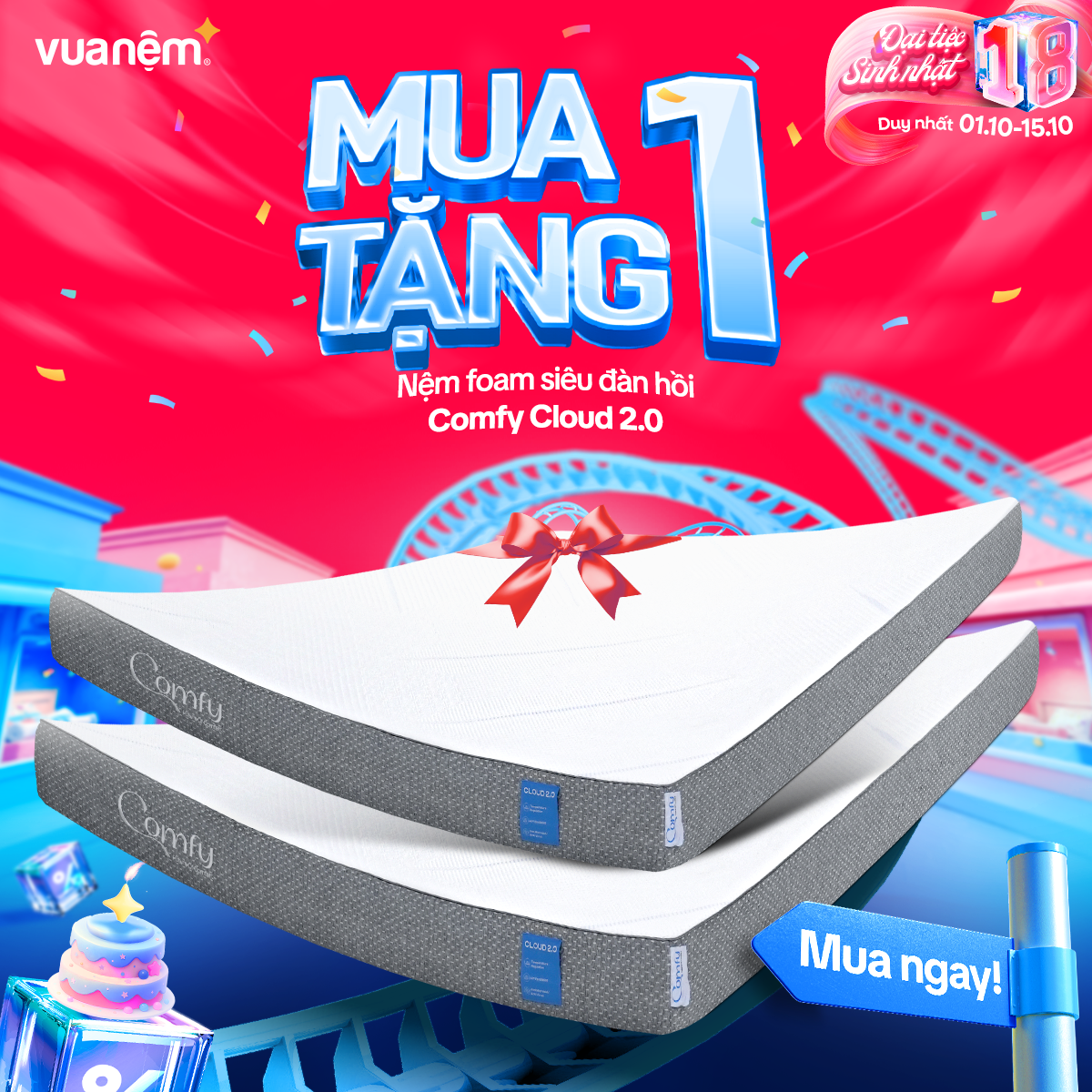 🎉 From 01/10 – 15/10, Vua Nệm goes big for its 18th birthday with crazy hot deals, tons of gifts, and unbeatable discounts worth up to tens of millions! The golden chance to own premium, authentic mattresses like never before: