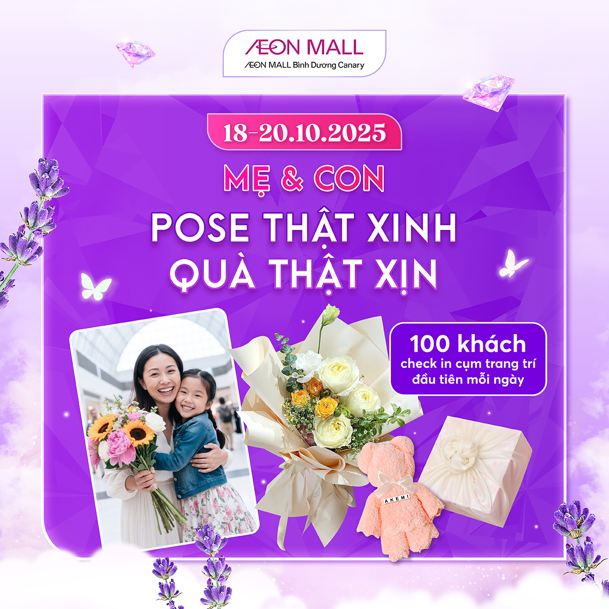 ĐẶC BIỆT, trong 3 ngày từ 18 - 20/10, 100 cặp mẹ – con đầu tiên mỗi ngày check-in tại cụm décor sẽ nhận ngay quà tặng đặc biệt từ AEON MALL Bình Dương Canary.