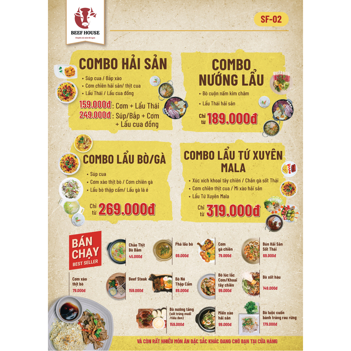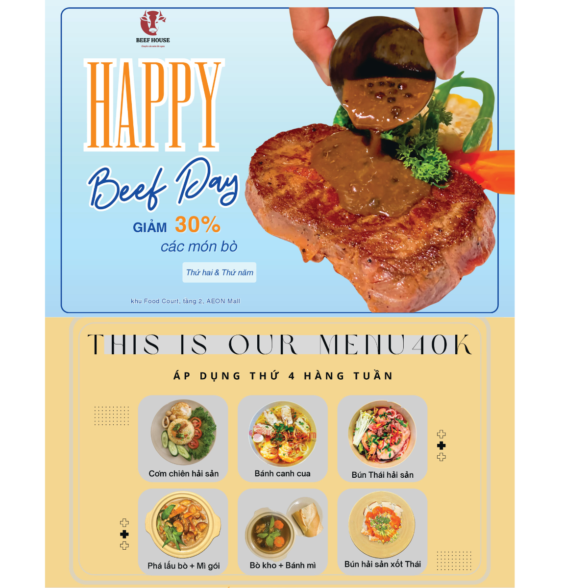 Beef House chuyên phục vụ các món Bò ngon như: Cháo bò, Gỏi bò, Bò kho, Beef Steak, Bò né, Bò cuốn bánh tráng rau rừng, Lẩu bò, ..... Nguyên liệu được lựa chọn kỹ từ nguồn chất lượng nhất và được chế biến bởi đầu bếp giỏi, lâu năm kinh nghiệm. Beef House cam kết mang đến cho khách hàng những món ăn ngon với mức giá cả phải chăng. Đồng thời, Beef House luôn chú trọng đến vệ sinh sạch sẽ, không gian sang trọng để khách hàng yên tâm thưởng thức món ăn. Nếu bạn đam mê món bò ngon và đang tìm kiếm một nơi để thưởng thức, hãy đến với Beef House để trải nghiệm những món bò ngon tuyệt vời nhất!