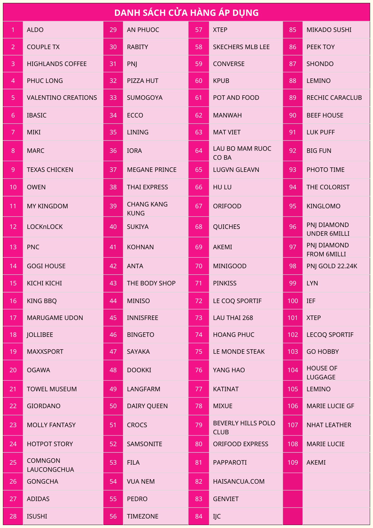 DANH SÁCH CỬA HÀNG ÁP DỤNG: